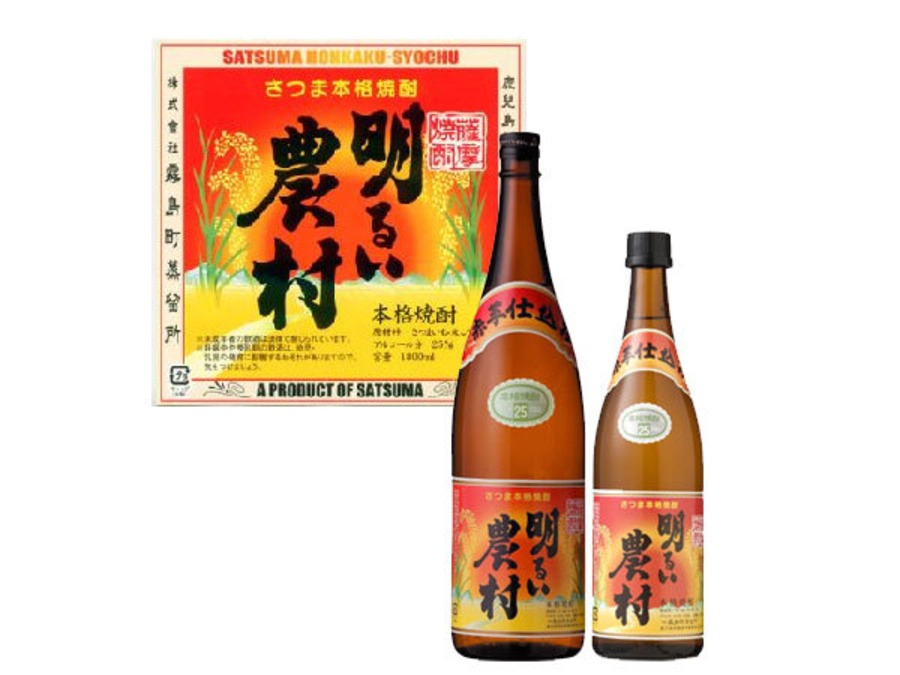 芋焼酎の多くはコガネセンガン(白芋ともいう)で仕込まれています。この焼酎の原料であるアヤムラサキ(赤芋)は、文字通り赤紫色を した芋です。また、ポリフェノールを豊富に含んでおり、体に良い食べ物としてもよく知られています。赤芋仕込「明るい農村」は、赤芋に よるフルーティな香りと、やさしい甘さ、すっきりした飲み口が特徴のいも焼酎です。