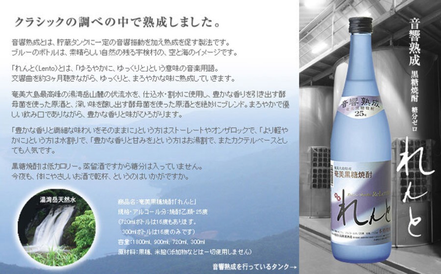 亜熱帯の島、奄美大島の南部宇検村に「れんと」の奏でる香りが生まれる奄美の名水と黒糖をベースに音響熟成システムによって 自然と音楽にゆりかごの中で熟成される…